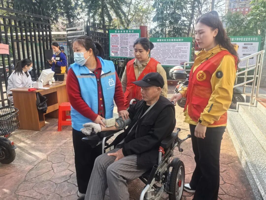 在健康义诊区域,志愿者主动协助医护人员开展工作,有序引导居民排队等候,协助完成血压、血糖检测,认真维护现场秩序。对行动不便的老年居民,主动上前帮扶,使用轮椅护送其至义诊点位,以细致周到的服务传递关怀与温暖,切实提升群众获得感、幸福感。